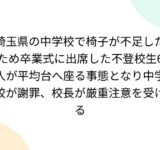 埼玉県の中学校で椅子が不足したため卒業式に出席した不登校生6人が平均台へ座る事態となり中学校が謝罪、校長が厳重注意を受ける