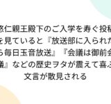 悠仁親王殿下のご入学を寿ぐ投稿を見ていると『放送部に入られたら毎日玉音放送』『会議は御前会議』などの歴史ヲタが震えて喜ぶ文言が散見される
