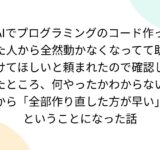 AIでプログラミングのコード作った人から全然動かなくなってて助けてほしいと頼まれたので確認したところ、何やったかわからないから「全部作り直した方が早い」ということになった話
