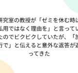 研究室の教授が「ゼミを休む時は私用ではなく理由を」と言っていたのでビクビクしていたが、「旅行で」と伝えると意外な返答が返ってきた