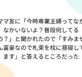 ママ友に「今時専業主婦ってなかなかいないよ?普段何してるの?」と聞かれたので「すみません富豪なので札束を枕に昼寝してます」と答えるところだった