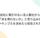 会社に取引のない法人数社から「米を買わないか」と売り込みが→サンプルを求めたら拒否された