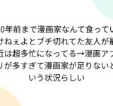 10年前まで漫画家なんて食っていけねぇよとブチ切れてた友人が最近は超多忙になってる→漫画アプリが多すぎて漫画家が足りないという状況らしい