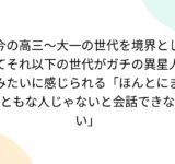 今の高三〜大一の世代を境界としてそれ以下の世代がガチの異星人みたいに感じられる「ほんとにまともな人じゃないと会話できない」