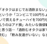 「オタクはまじでお酒飲まない」というか「コンビニで100円ちょいで買えるチューハイを700円も払うのはアド損」みたいな価値観と思う話…「酒飲むオタクは家で飲む」「飲み友達がいない」など