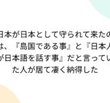 日本が日本として守られて来たのは、『島国である事』と『日本人が日本語を話す事』だと言っていた人が居て凄く納得した