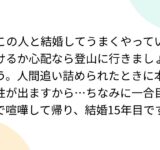 この人と結婚してうまくやっていけるか心配なら登山に行きましょう。人間追い詰められたときに本性が出ますから…ちなみに一合目で喧嘩して帰り、結婚15年目です