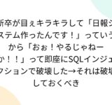 新卒が目ぇキラキラして「日報システム作ったんです!」っていうから「おぉ!やるじゃねーか!!」って即座にSQLインジェクションで破壊した→それは破壊しておくべき