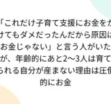 「これだけ子育て支援にお金をかけてもダメだったんだから原因はお金じゃない」と言う人がいたが、年齢的にあと2~3人は育てられる自分が産まない理由は圧倒的にお金