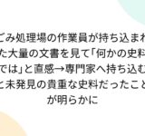 ごみ処理場の作業員が持ち込まれた大量の文書を見て「何かの史料では」と直感→専門家へ持ち込むと未発見の貴重な史料だったことが明らかに