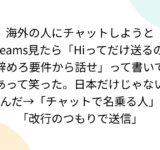 海外の人にチャットしようとteams見たら「Hiってだけ送るの辞めろ要件から話せ」って書いてあって笑った。日本だけじゃないんだ→「チャットで名乗る人」「改行のつもりで送信」