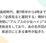 高校時代、朝7時半から8時までの『全部見ると遅刻する』微妙な時間に“アルプスの少女ハイジ”の再放送をしており、あの名作回の放送日にとある事件が起きた