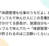 「体調管理も仕事のうちだよ」とインフルで休んだ人にこの言葉投げかけてる部長が、翌週自分もインフルで休んでた→「体調管理~が許されるのは二日酔いくらい」