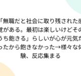 「無職だと社会に取り残された感覚がある。最初は楽しいけどそのうち飽きる」らしいが心が元気だったから飽きなかった→様々な体験、反応集まる