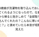 9歳娘が洗濯物を取り込んでおいてくれるようになったので、仕事から帰ると抱きしめて「全部取り込んでくれたの?こんなに寒いのに?」と褒めていたら本音が垣間見えた