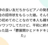 仲の良い友だちからピアノの発表会の招待状をもらった娘。そんなの初めてのことなので本人も親もソワソワしてたけど、平和に終わった話→「鬱展開かとドキドキした」