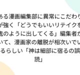 ある漫画編集部に異常にこだわりが強く「どうでもいいリテイクを鬼のように出してくる」編集者がいて、漫画家の離脱が相次いでいるらしい「神は細部に宿るの誤読」