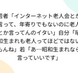 若者「インターネット老人会とか言って、年寄りでもないのに老人とか言ってんのイタい」自分「昭和生まれも老人ってほどではないもんね」若「あ…昭和生まれなら言っていいです」