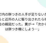 町内の餅つきの人手が足りないからと近所の人に駆り出されたら社会の縮図だった。糞が→「次からは餅つき機にしよう…」