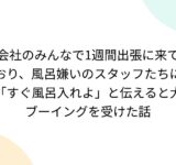 会社のみんなで1週間出張に来ており、風呂嫌いのスタッフたちに「すぐ風呂入れよ」と伝えると大ブーイングを受けた話