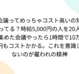 会議ってめっちゃコスト高いの知ってる?時給5,000円の人を20人集めた会議やったら1時間で10万円もコストかかる。これを意識しないのが雇われの精神