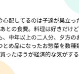 今心配してるのは子達が巣立ったあとの食費。料理は好きだけども、中年以上の二人分、夕方のおつとめ品になったお惣菜を数種類買ったほうが経済的な気がする