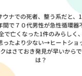 サウナでの死者、整う系だと、10年間で70代男性が急性循環器不全で亡くなった1件のみらしく、思ったより少ない→ヒートショックはさておき発見が早いからでは?