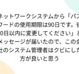 ネットワークシステムから「パスワードの使用期限は90日です。後30日以内に変更してください」とメッセージが届いたので、この会社のシステム管理者はクビにした方が良いと思う