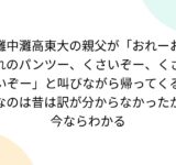 灘中灘高東大の親父が「おれーおれのパンツー、くさいぞー、くさいぞー」と叫びながら帰ってくるなのは昔は訳が分からなかったが今ならわかる