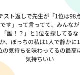 テスト返しで先生が「1位は98点です」って言ってて、みんなが「誰!?」と1位を探してるなか、ぼっちの私は1人で静かに1位の気持ちを味わってるの最高に気持ちいい