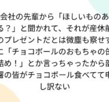 会社の先輩から「ほしいものある?」と聞かれて、それが産休前のプレゼントだとは微塵も察せずに「チョコボールのおもちゃの缶詰め!」とか言っちゃったから部署の皆がチョコボール食べてて申し訳ない
