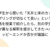 学生から聞いた「天井と床のカップリングが切なくて良い」という話を授業で紹介したら、別の学生が異なる解釈を提示してきた→ハッピーエンドか否かが議論に