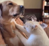 ラブラブの猫と犬がお互いにマッサージのテクニックを披露する