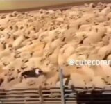 数が多くて身動きが取れない羊たち…牧羊犬が背中の上を疾走して誘導する