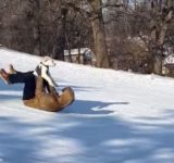 「人間ソリ」に乗って雪の斜面をすべり降りる犬(動画)
