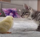 子猫とヒヨコの初めての出会い…おそるおそる顔を近づける1匹と1羽(動画)