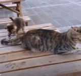 「負けないぞー」ママのしっぽと全力で対決する子猫(動画)