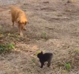おびえる子猫と仲良くなりたいゴールデンレトリバーが取った行動