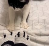 「猫が肉球でベッドをモミモミしていたので…猫足ソックスで対抗してみた」(動画)