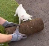 「ここはまかせて!」ちいさな犬が全身を使ってロール芝の敷設を手伝う