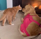 手術から帰宅した犬がしょんぼりしていたら…猫がそっと寄り添ってあげる