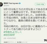【日台友好】「令和の時代も、最高のパートナーであり続けられますように!」台湾の蔡英文総統が日本語でメッセージ