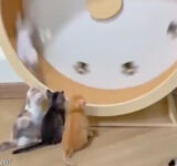 「それでも挑戦する小さな子猫たち…」回し車のスピードが激しいとき