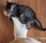「いい勝負!?」子猫が犬のシッポと戦い続ける