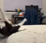 ベッドから大股開きで転がり落ちた猫…恥ずかしそうに隠れる(動画)