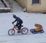 「信頼の証?」そりに乗せた犬を自転車で少年が引っぱる