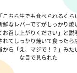 「こちら生でも食べられるくらい新鮮なレバーですがしっかり焼いてお召し上がりください」と説明されてしっかり焼いて食ったら店員から「え、マジで!?」みたいな目で見られた