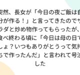 突然、長女が「今日の夜ご飯は自分が作る!」と言ってきたのでサラダと炒め物作ってもらったが、食べ終わる頃に「今日は母の日でしょ?いつもありがとうって気持ちで作ったんだ」と言われて号泣した