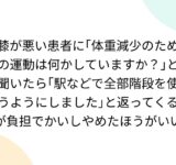 膝が悪い患者に「体重減少のための運動は何かしていますか?」と聞いたら「駅などで全部階段を使うようにしました」と返ってくるが負担でかいしやめたほうがいい