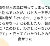 車を他人の車に擦ってしまって落ち込んでいたが、パトカーを呼ぶ間4歳が「けいさつ、じゅうもってるかな…」と心配したり、警察に「このひと、わざとじゃないんです」と庇ってくれたりしたのが良かった